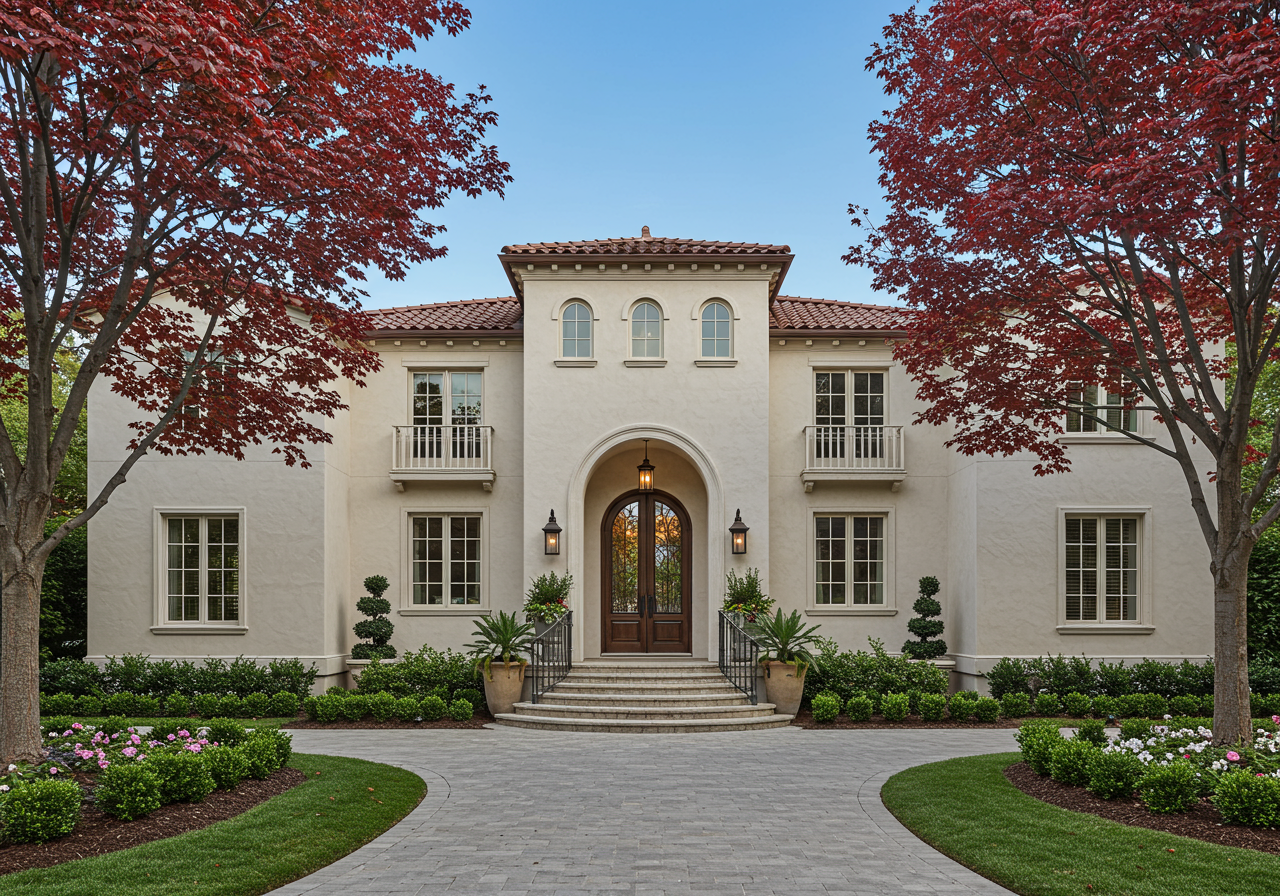- The backyard features an outdoor kitchen, a large covered patio, and a lush green lawn.